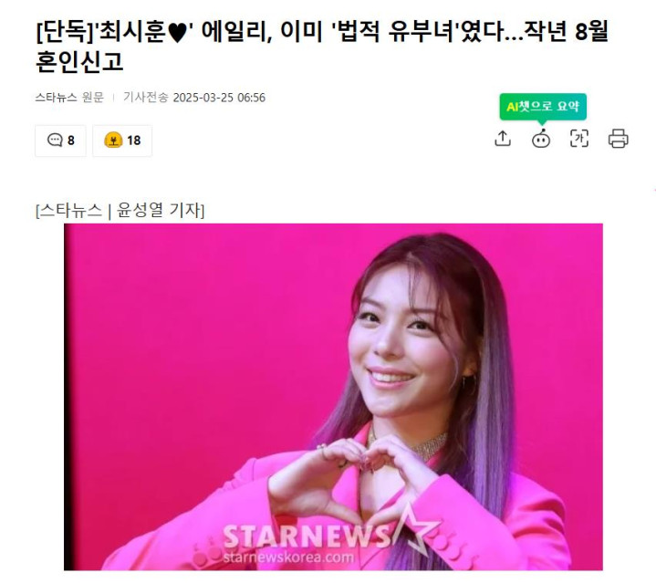大家好呀~这里是你们的小娱! 今天要和大家分享一个超级甜蜜的消息!韩国实力派女歌手Ailee(李艺真) 居然 早就是"法律上的已婚女" 了!据韩国媒体3月25日报道,Ailee和男友崔时勋其实去年8月就已经完成婚姻登记,只是婚礼定在今年4月才办!这波操作也太低调了吧!